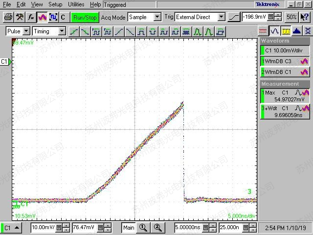 如图所示,60 000个脉冲叠加,我们可以看到低振荡和抖动的脉冲优异性,这个测量证明了ModBox-Front-end高稳定和可靠性的脉冲产生性能。