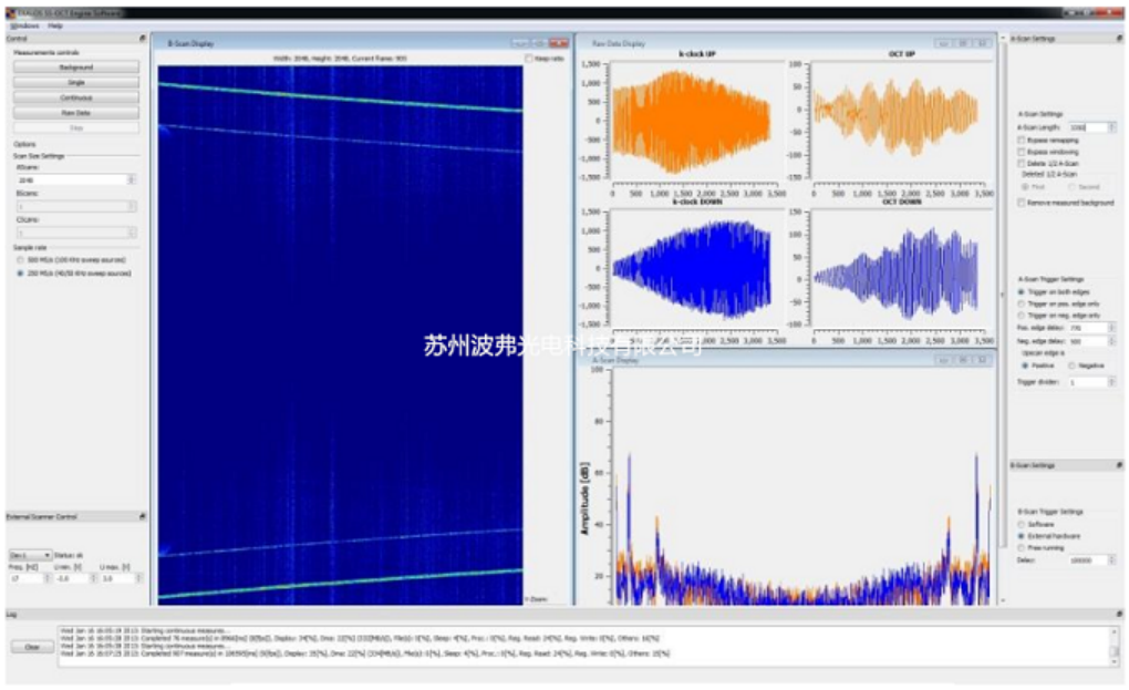 OCT信号处理基于k时钟信号采集,实时相位展开和先进的线性化算法,可实现类似于使用样条插值的离线处理的高质量A扫描。 光谱加窗,色散补偿和背景减法是实时独立进行的,用于前向和后向扫描。 显示引擎执行视频速率(> 25 fps)显示A扫描(每个阵列2,048个点)和B扫描(每个B扫描1024个A扫描)。更多产品完整信息,请联系苏州mksport体育光电科技有限公司,联系电话:0512-62828421,咨询邮箱:sales@ !