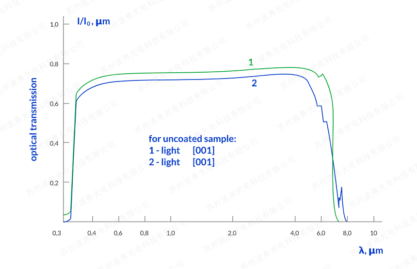 标准TeO2材料在0.450-5 mkm范围内更好;标准TeO2晶体在特殊技术下生长,最大透射率在0.350 - 0.450 mkm范围内,适用于对澄清效应敏感的应用;在特殊技术下生长的标准TeO2晶体最大限度地减少了2.7 - 3.2 mkm范围内的-OH基团,以满足应用所需的平面传输范围。
